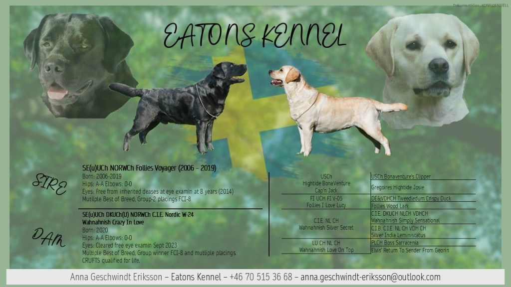Jag är medlem i Svenska Kennelklubben och Labradorklubben och följer de riktlinjer som de båda klubbarna anger för ansvarsfull hunduppfödning.