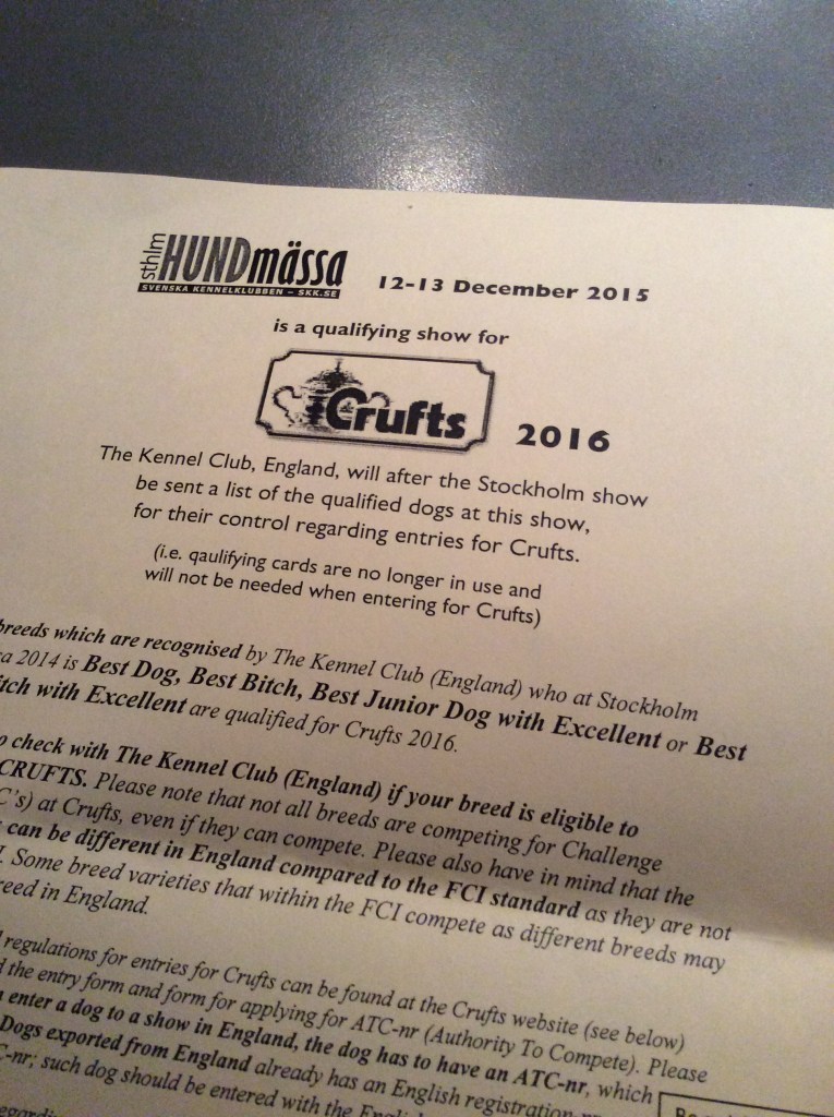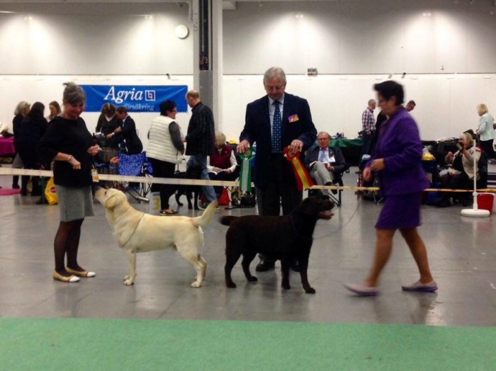 Är så stolt över resultatet på utställningen i Stockholm 13 december. Follies Wilson vann unghundsklassen, blev bästa hane med cert, CACIB och BIM. Ville får nu också titulera sig Nordisk Vinnare 2015 och har en inbjudan att delta på Crufts 2016, tillsammans med sin pappa Ch Follies Voyager. Labnova Salty Zaga Fairytale gick i öppen klass och fick excellent 🙂